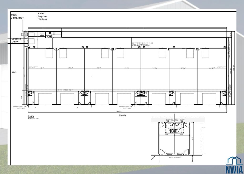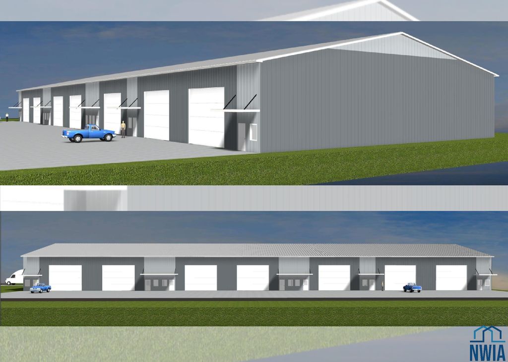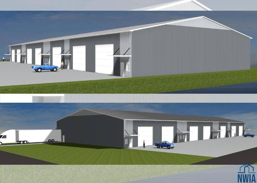 BRAND NEW Commercial warehouse spaces available for LEASE spring 2026! Located ONE block off highway 75, high visibility and easy access on 25th Street NE in Sioux Center. These 7 newly constructed units offer 4,200 square feet each of temperature-controlled warehouse space, shared loading dock, dock alley with direct unit access, loading & walk in doors, trash compactor and pallet wrapper machine. Warehouse units each equipped with 20' x 18' overhead door, walk-in access and a finished half bath. Other features; fire sprinklers, Heat/AC, water, and sewer. 2 year minimum lease requirement, subject to HOA.